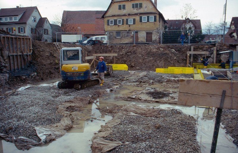 Wenn die Baumaßnahme neben einem Bestandsbau liegt, dann ist manchmal auch eine Unterfangung der Nachbargebäudes erforderlich. Erst dann kann die Baugrube auf die endgültige Tiefe ausgehoben werden.
