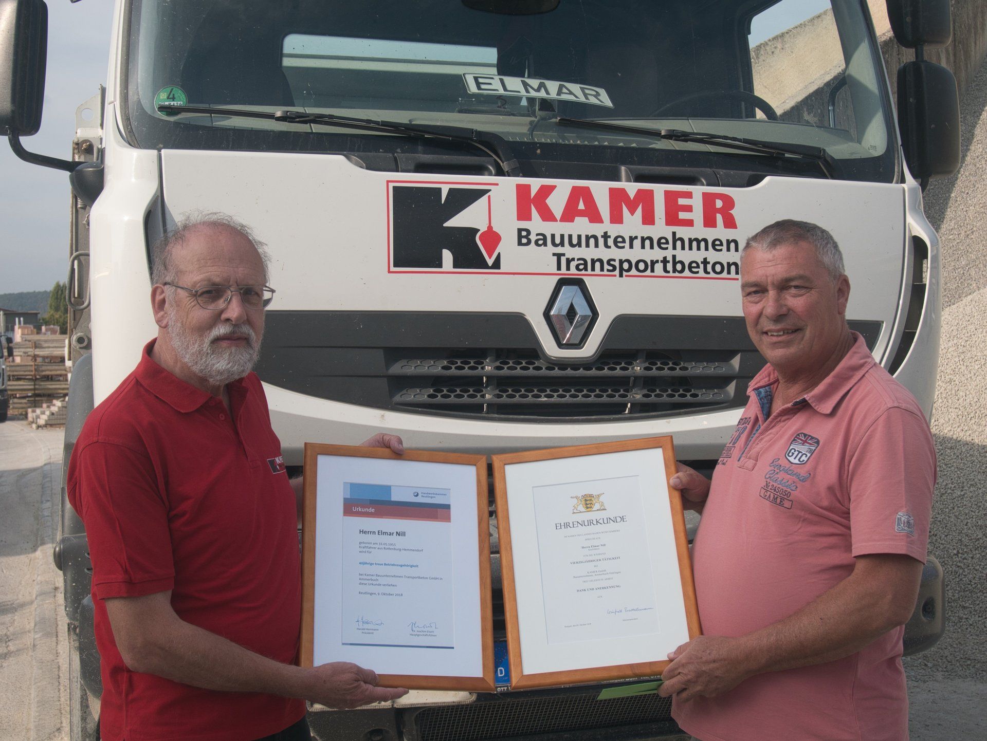 Das Baugeschäft Kamer hat (schon) wieder ein 40 Jähriges Jubiläum zu feiern! Im Rahmen einer kleinen Zeremonie wurden unserem LKW-Fahrer Elmar Nill für seine langjährige Mitarbeit Urkunden des Landes Baden-Württemberg sowie der Handwerkskammer Reutlingen überreicht. Dies ist nun schon das zweite 40-Jahre-Jubiläum innerhalb von 2 Jahren in unserem Betrieb, weitere können bald folgen. Wir sind besonders stolz darauf, dass wir viele unserer Mitarbeiter ausgebildet haben und diese uns sehr lange treu begleiten.